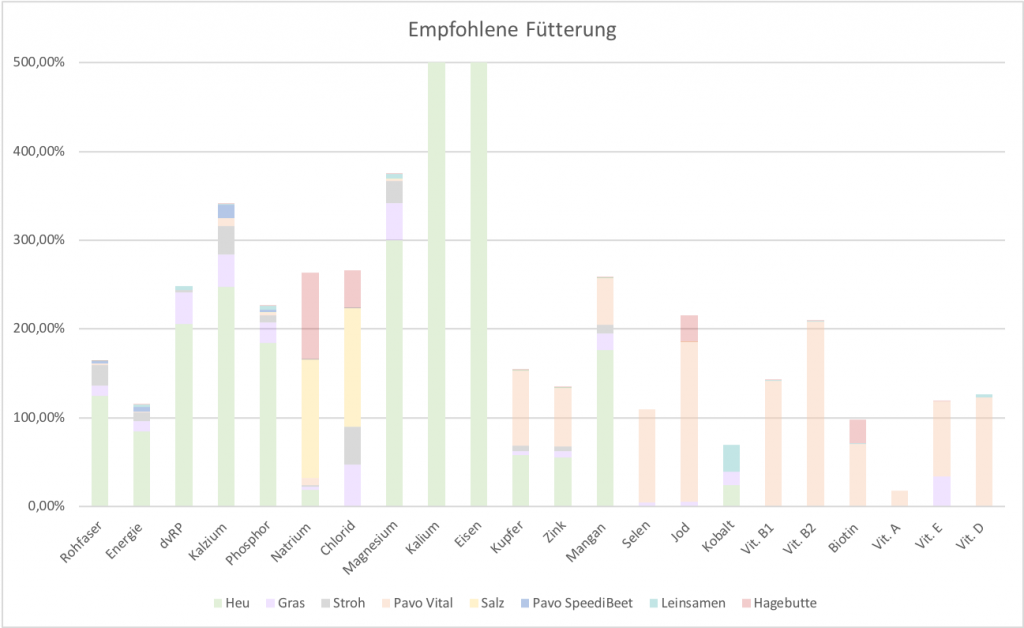 Nach der Erhebung des Ist-Zustandes im Stall, stelle ich die aktuelle Fütterung dem Bedarf deines Pferdes gegenüber. Anschließend erfolgt eine Optimierung der Futterration deines Pferdes, um den Bedarf an Energie, Protein, Rohfaser, Spurenelementen und Mineralien ausreichend zu decken und Über- und Unterversorgungen zu vermeiden. Es wird genauer auf die Risiken möglicher Über- und Unterversorgungen eingegangen und gegebenenfalls auch die Ergebnisse vorhandener Blutanalysen interpretiert.
